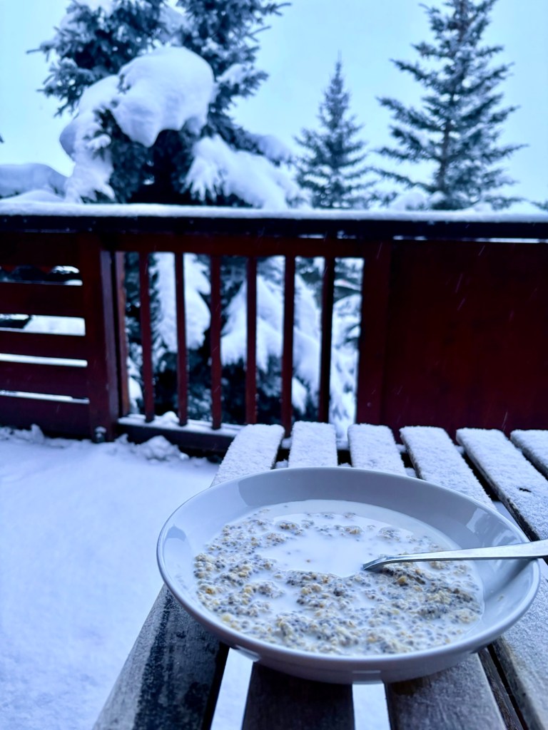 Sitting on the terrace as snow, finer than dust, swirls around me eating porridge. Thick fog covers the mountain. Everyday is completely new….